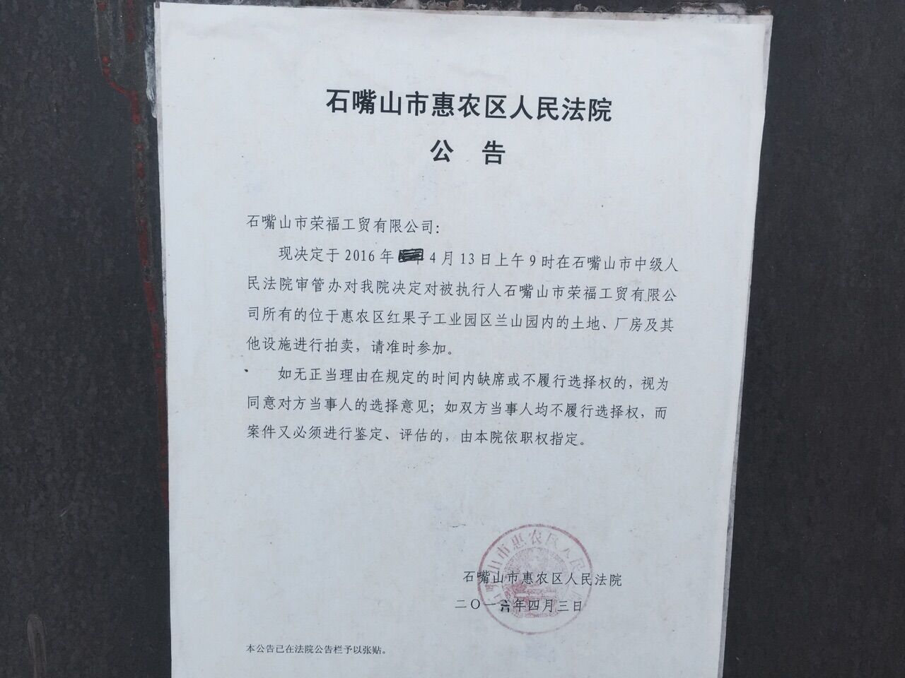 受石嘴山市惠農(nóng)區(qū)人民法院的委托,本公司定于2016年5月19日(星期四)15時(shí)舉行拍賣會(huì)對(duì)位于惠農(nóng)區(qū)紅果子鎮(zhèn)蘭山園內(nèi)的土地及地上建筑物、院內(nèi)設(shè)備進(jìn)行公開(kāi)拍賣。四至:東臨趙會(huì)友用地,南臨空地,西臨石嘴山市榮福工貿(mào)有限公司用地,北臨規(guī)劃路。其中:土地使用權(quán)面積6000平方米,工業(yè)用地;建筑物面積341.44平方米,為工業(yè)廠房;設(shè)備:跳汰洗煤機(jī)一套及高頻篩兩臺(tái)。